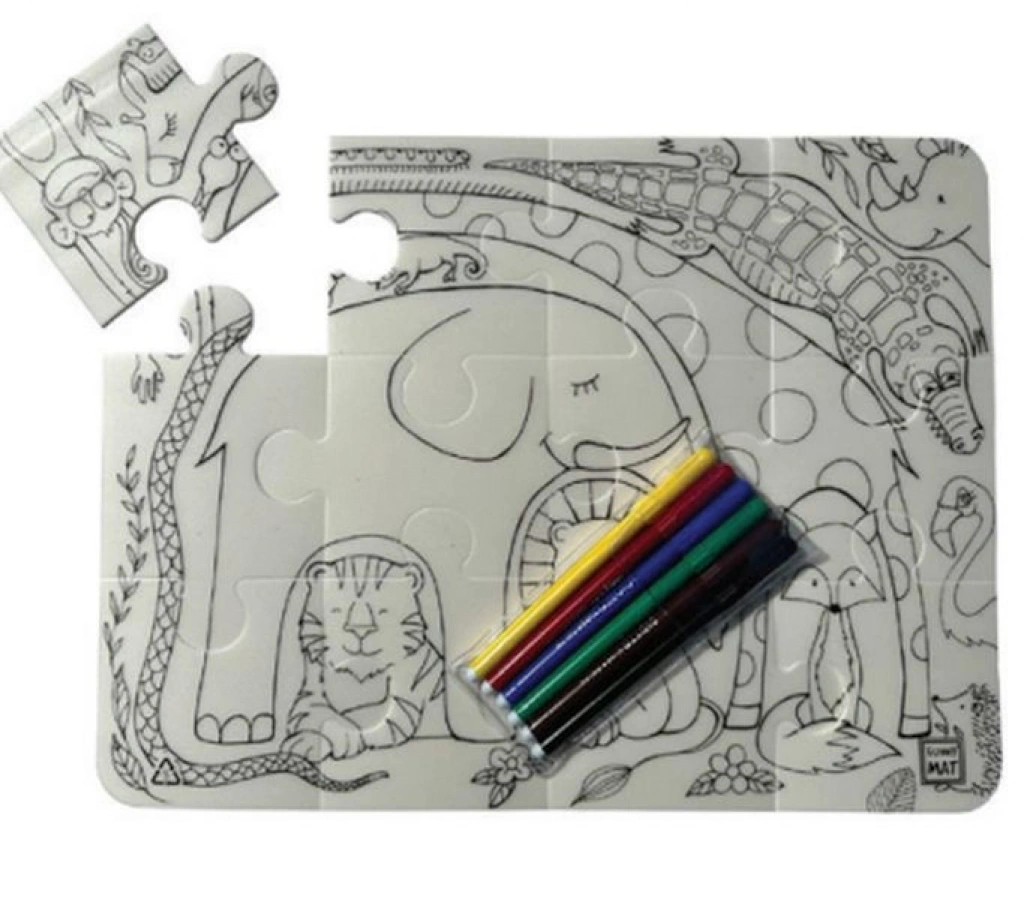 Yapboz parçalarını düz bir zemin üzerinde birleştirin. Ortaya çıkan resmi su bazlı keçeli kalemlerle istediğiniz renklere boyayın. İsterseniz desenlere eklemeler yapabilirsiniz! Herhangi bir parçayı kolayca silebilir, yıkayabilir veya Funny Mat Washable Puzzle'ın tamamını ıslak bir bezle silebilirsiniz. Yapbozu farklı şekillerde birçok kez boyayabilirsiniz.
