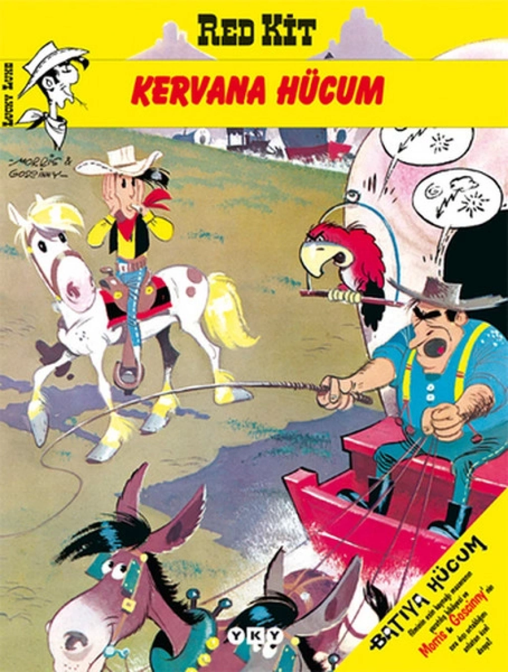 Yalniz kovboy Red Kit bu defa Kaliforniya'ya giden göçmenlerin yardimina kosuyor. Birbirinden ilginç karakterlerden olusan bu kervanin eglenceli ve bir o kadar da tehlikeli serüvenleri geçtigimiz yil beyaz perdeye de uyarlanmisti. Ayrica Red Kit sevenleri bu albümde bir sürpriz bekliyor: Morris ve Goscinny ikilisinin Red Kit efsanesinin dogusunu ve Red Kit'in geçirdigi dönüsümleri içeren 16 sayfalik özel bir bölüm.